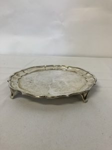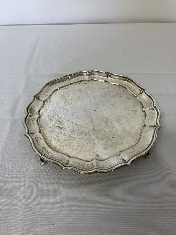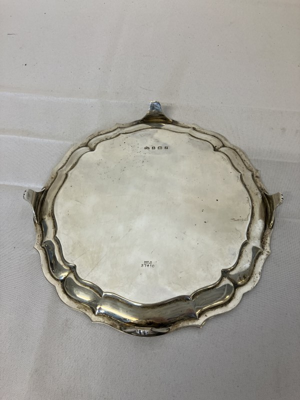 English silver salver having pie crust border and raised on 4 feet, Birmingham 1949, 11 troy ozs.