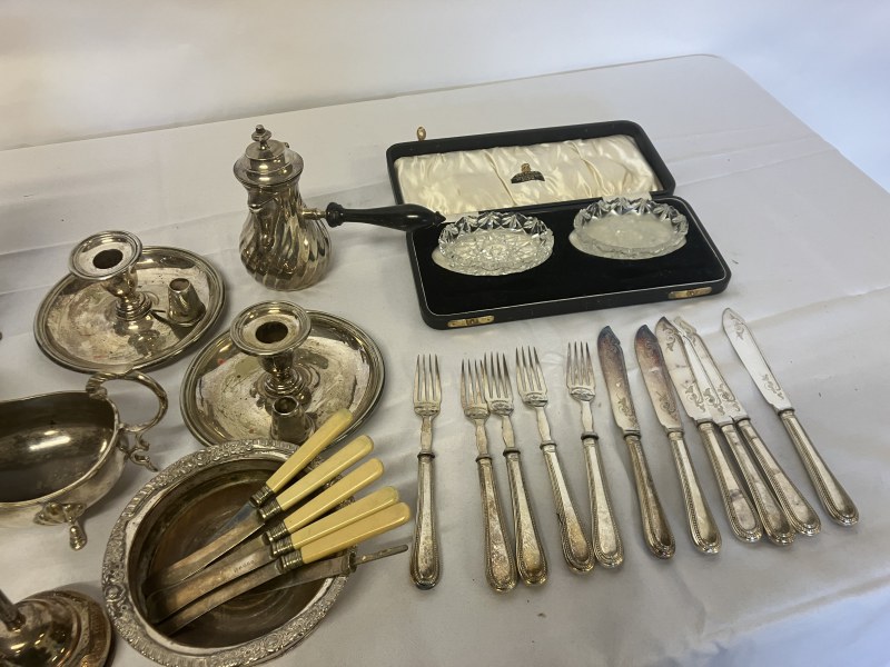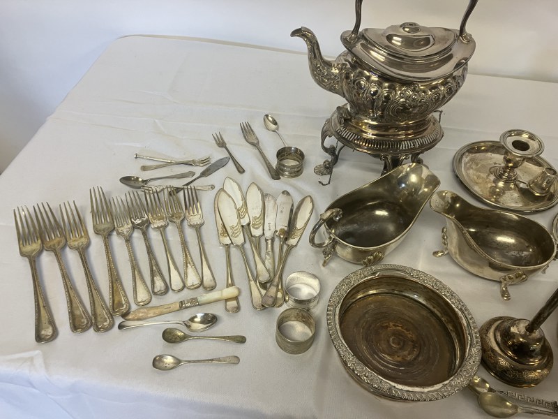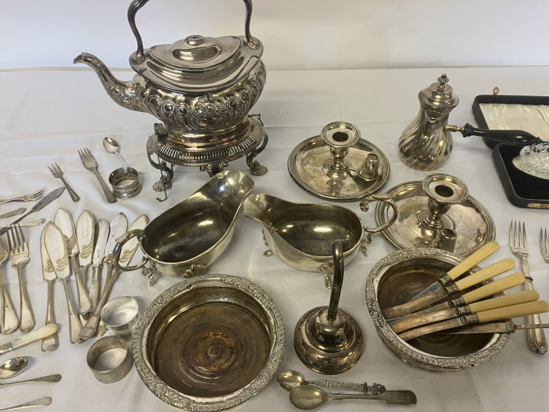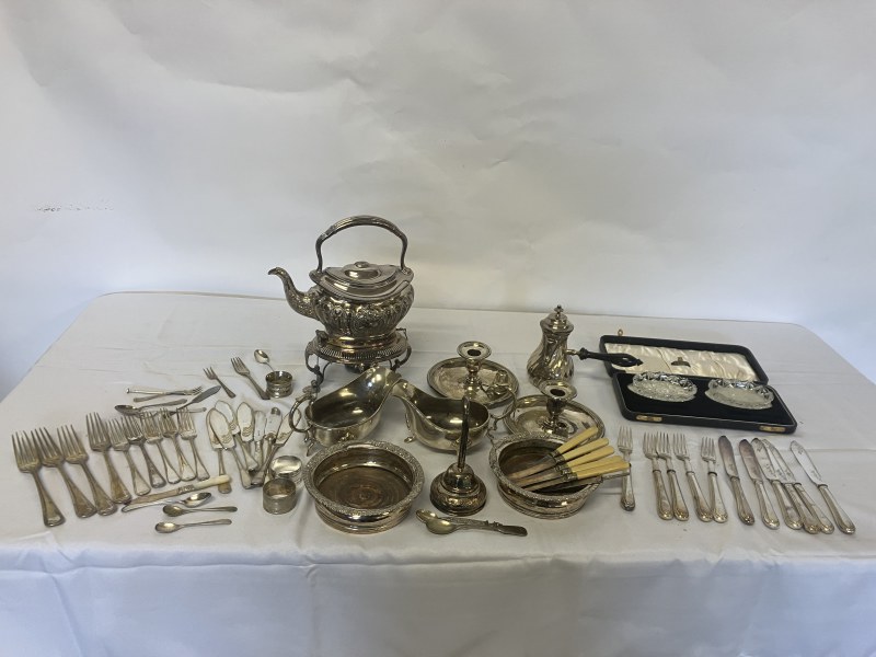 Lot of plated ware to include spirit kettle, chamber sticks, wine coaster, etc.