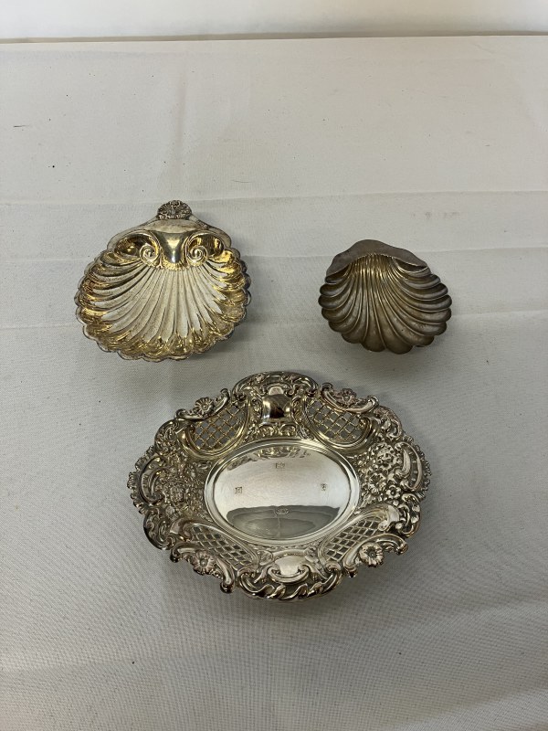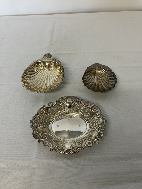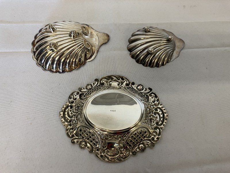 Modern English silver oval shaped dish, Birmingham and two shell shaped silver dishes, Sheffield. Total weight 6 troy ozs.