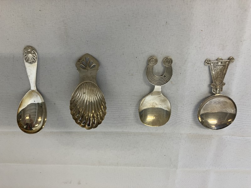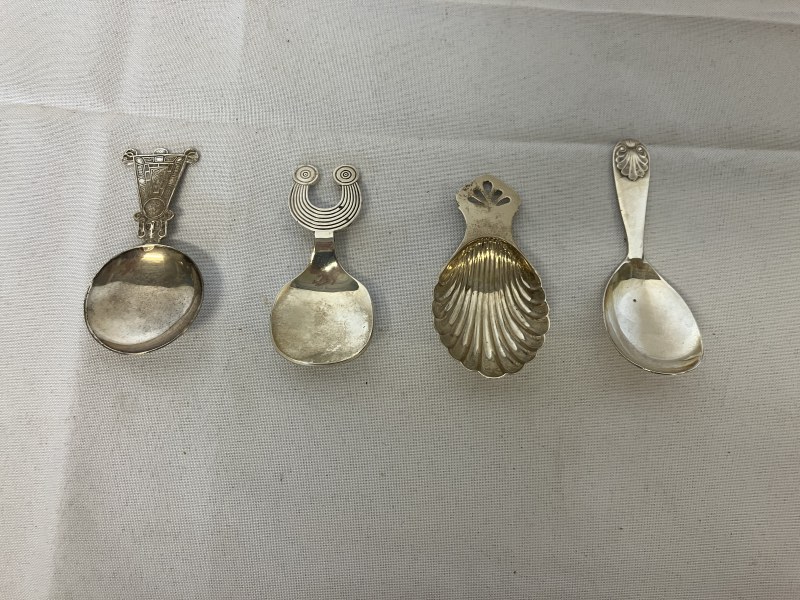 Four Irish silver caddy spoons, Dublin 1973 with EEC mark, markers 3 x J.M. Co., one stamped O.C. , weight 2 troy ozs.