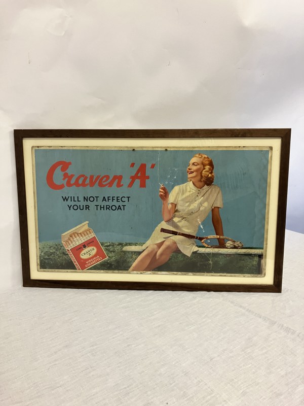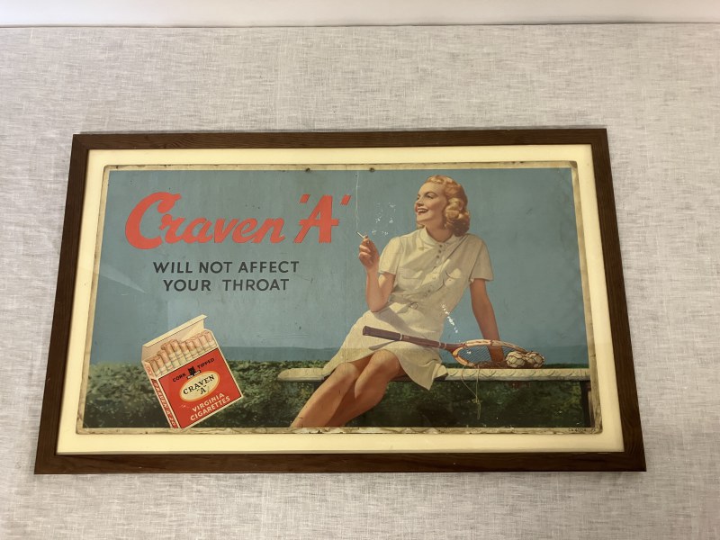 Old framed Craven A cigarette advertising sign. Sign size - 32cm x 58cm.