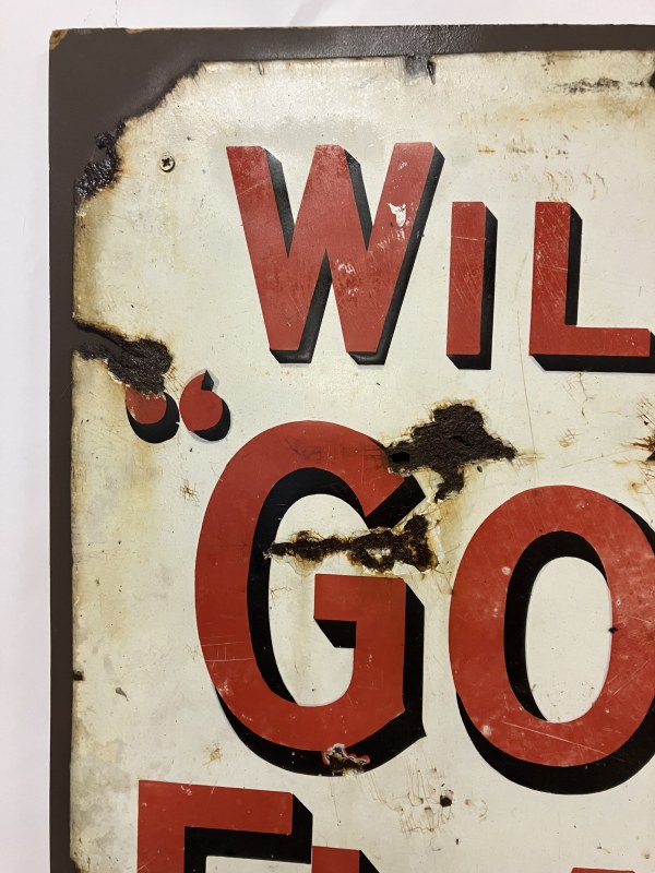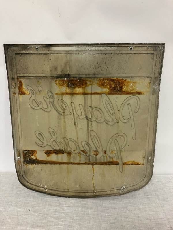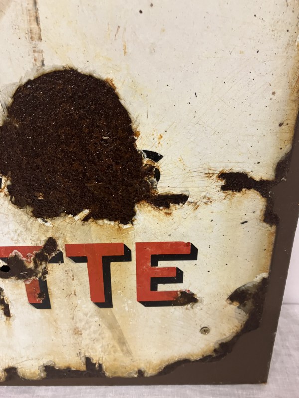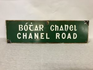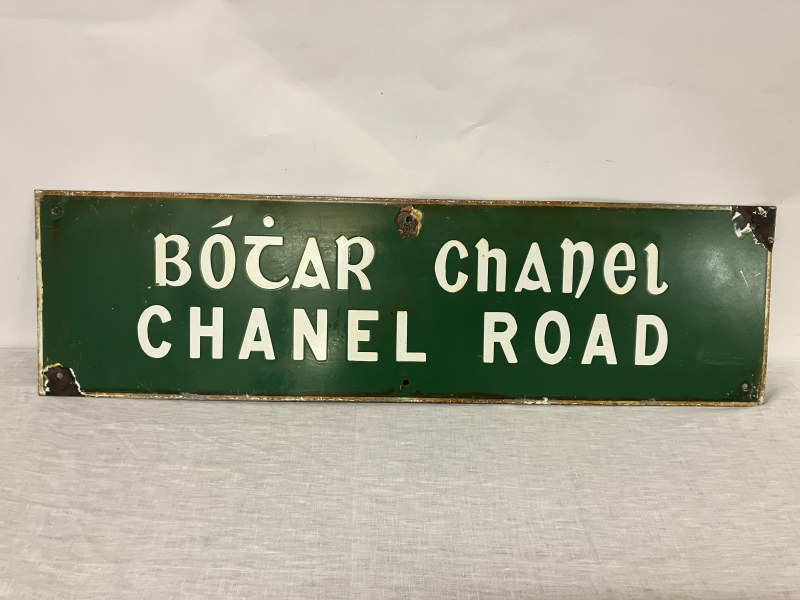 Old metal sign in Irish & English for Chanel Road, (Dublin). Sign size - 26cm x 92cm.