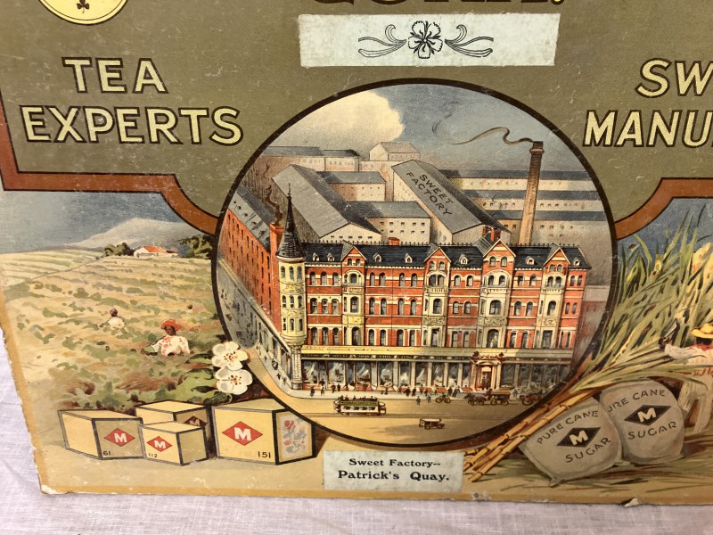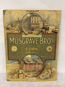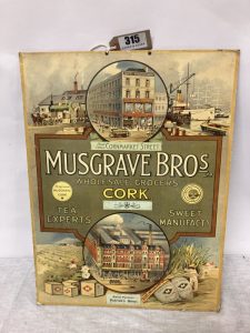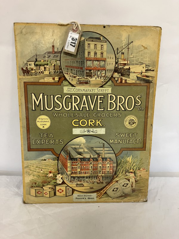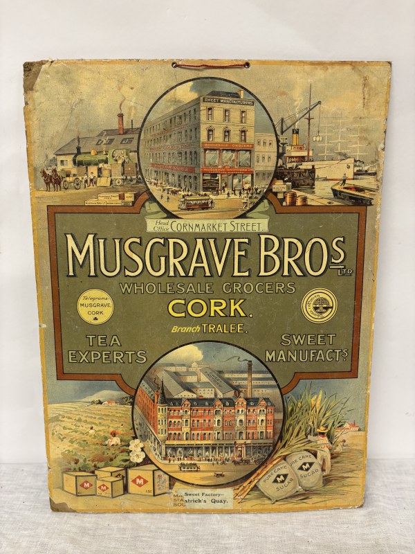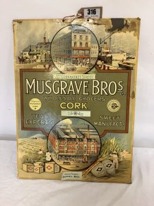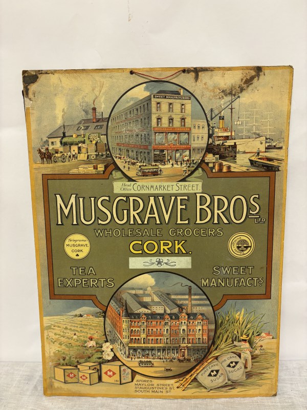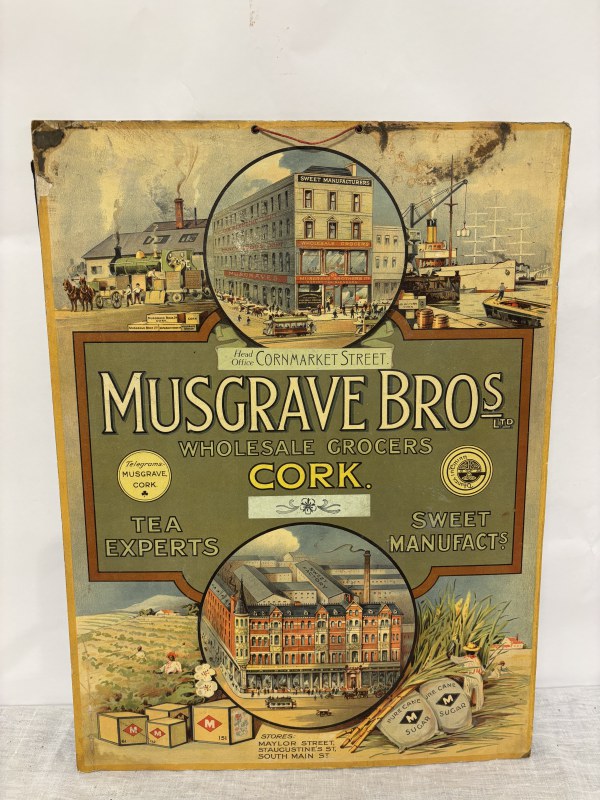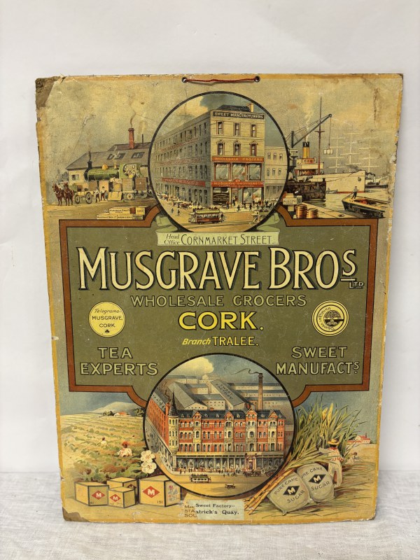 A rare old Musgrave Bro's Advertising sign showing Cork scenes, the head office at Cornmarket St, Cork, The Metropole Hotel, McCurtain St. Cork and Sweet Factory, etc.