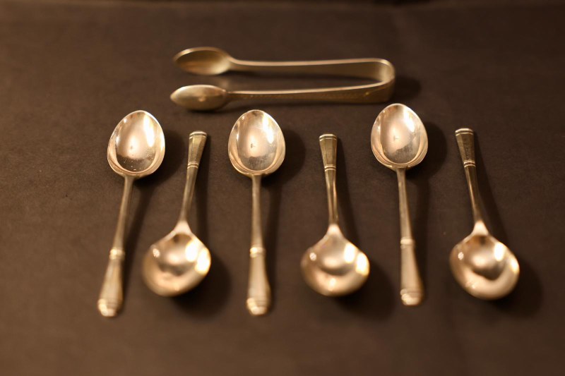 A set of 6 silver teaspoons, Sheffield 1939 together with a Victorian silver sugar tongs. (7)