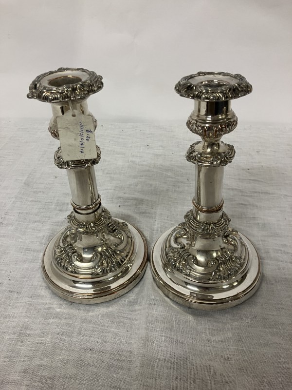 A pair of Victorian silver plated telescopic candlesticks having raised decoration and circular bases.