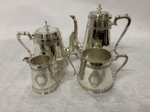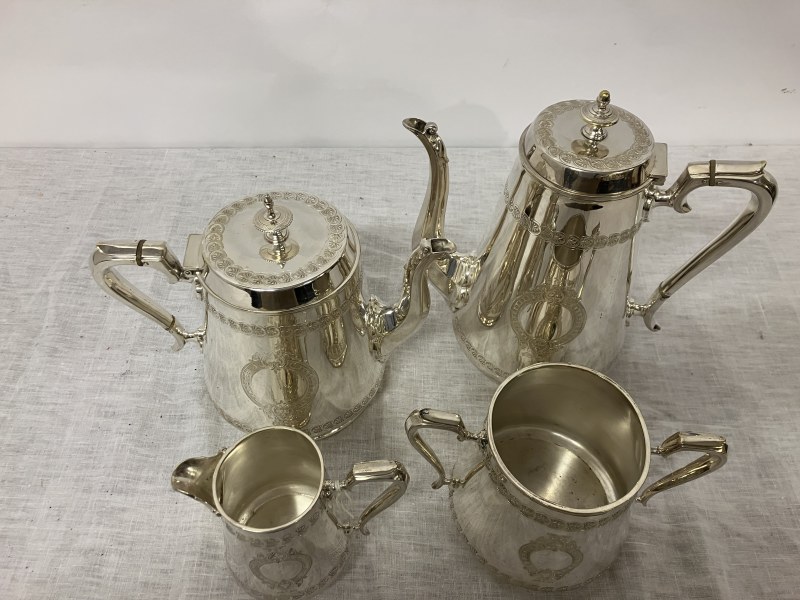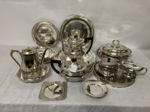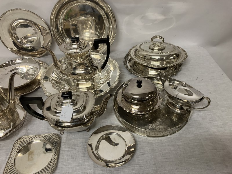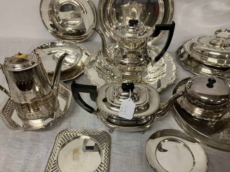 Large lot of plated ware - circular trays, tea & coffee pots, entree dishes, etc.