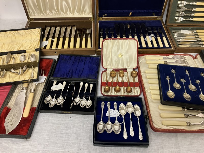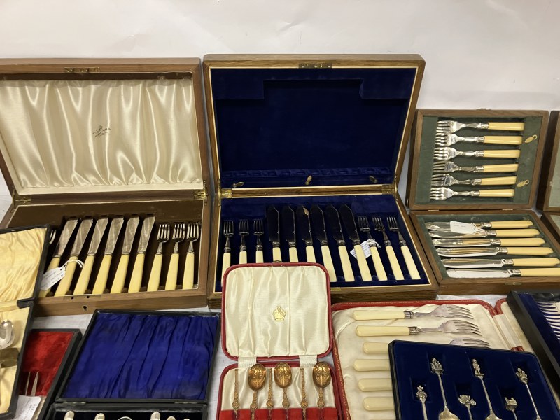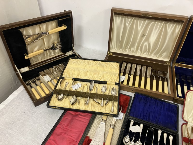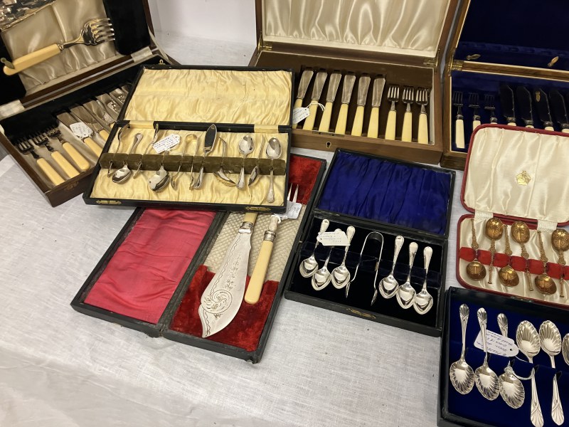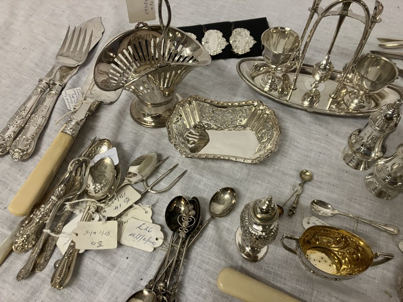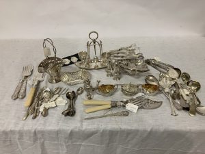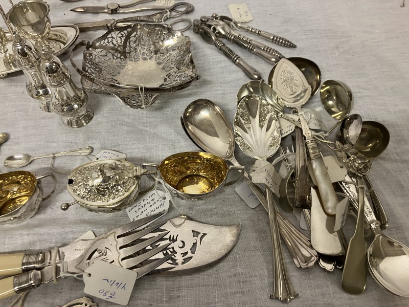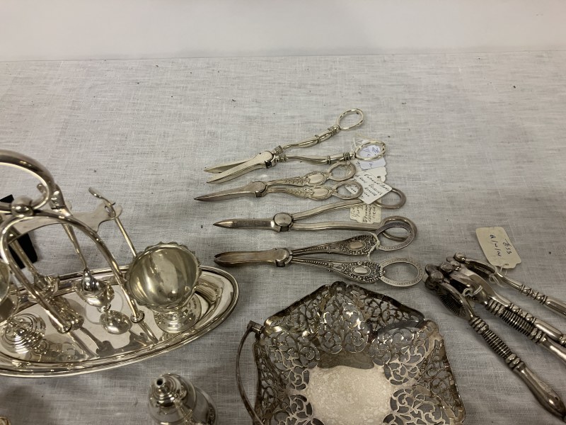 Mixed lot of plated ware - condiment sets, grape scissor, spoons, Egan's of Cork letter opener, etc.