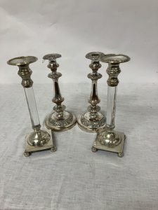 A pair of Victorian Sheffield plated candlesticks on circular bases and a pair of plated and glass column candlesticks on square bases.