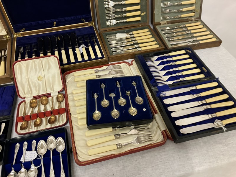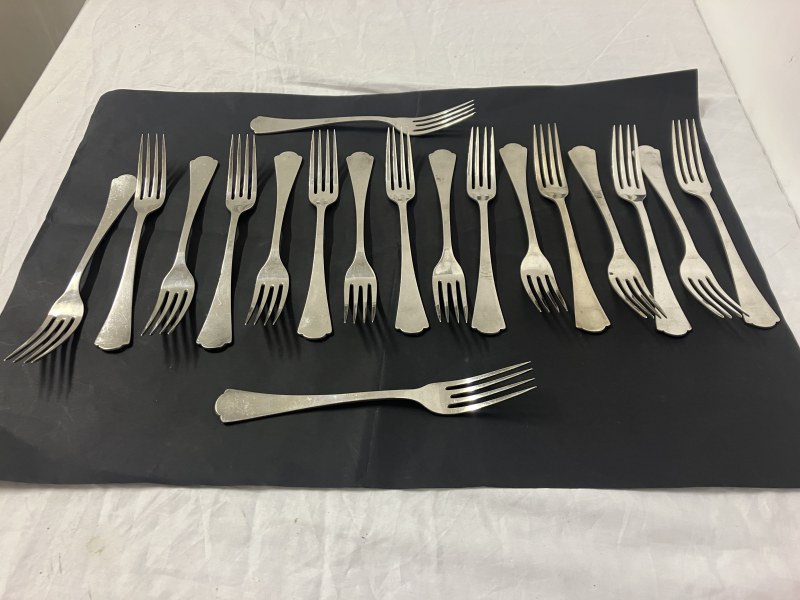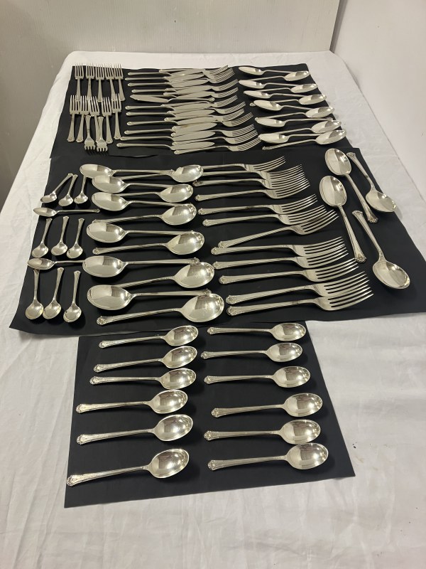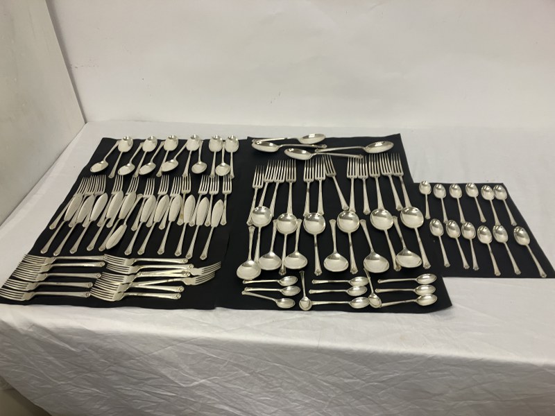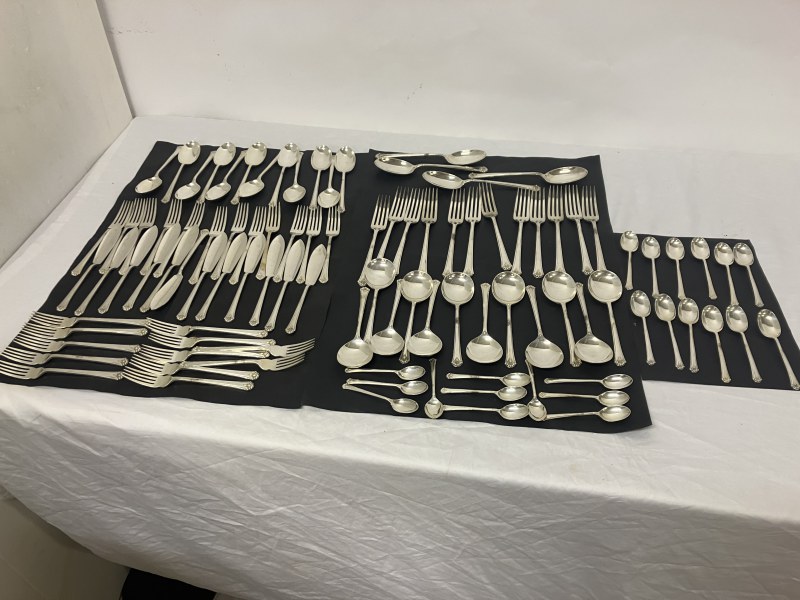 A large suite of English silver flatware, Sheffield 1978 comprising of 12 soup spoons, 12 large dinner forks, 12 dessert spoons, 12 dessert forks, 12 fish knives, 12 fish forks, 4 large serving spoons, 12 teaspoons, & 11 coffee spoons. Makers mark Cooper Brothers & Sons. Total weight 147 troy ozs.