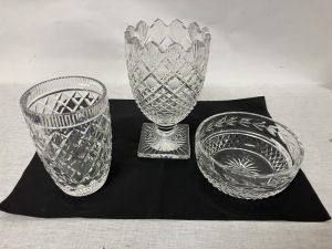 Large heavy Waterford glass bowl with serrated edge and 2 other pieces.