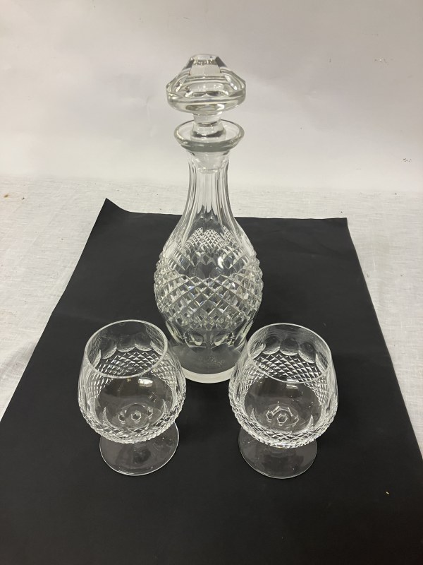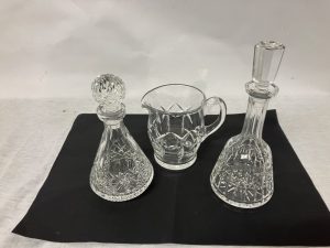 Two Waterford cut glass decanters and stoppers and a large water jug. (3)