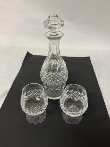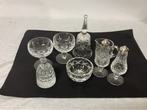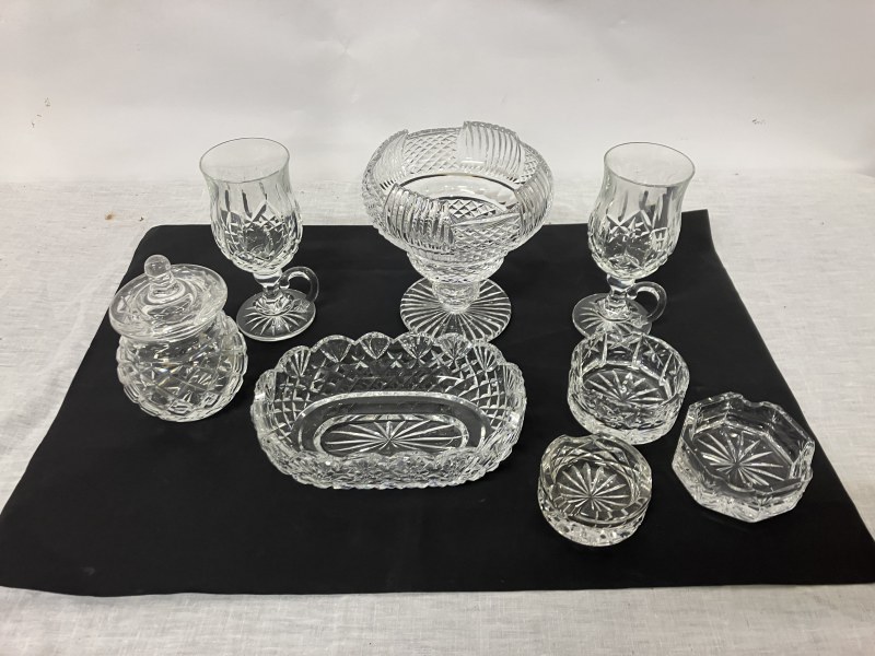Waterford glass bowl, dish, ash trays, Irish coffee glasses and jar with lid.