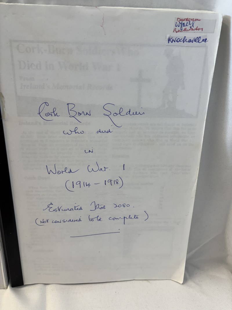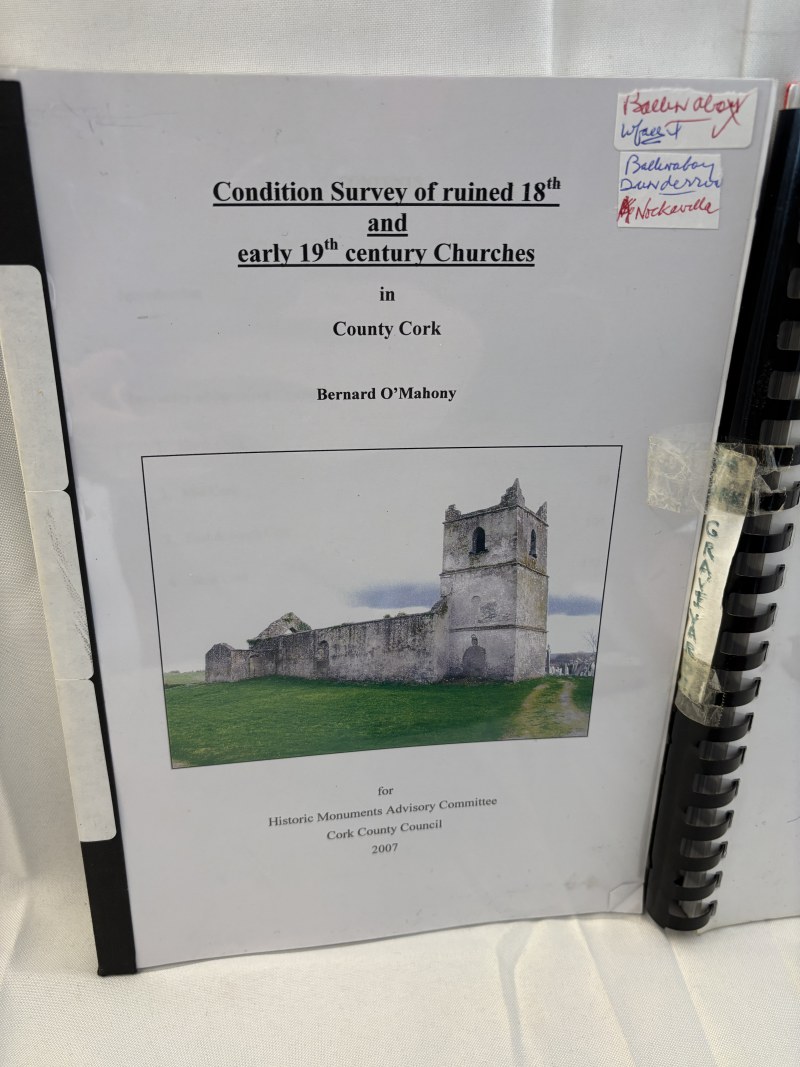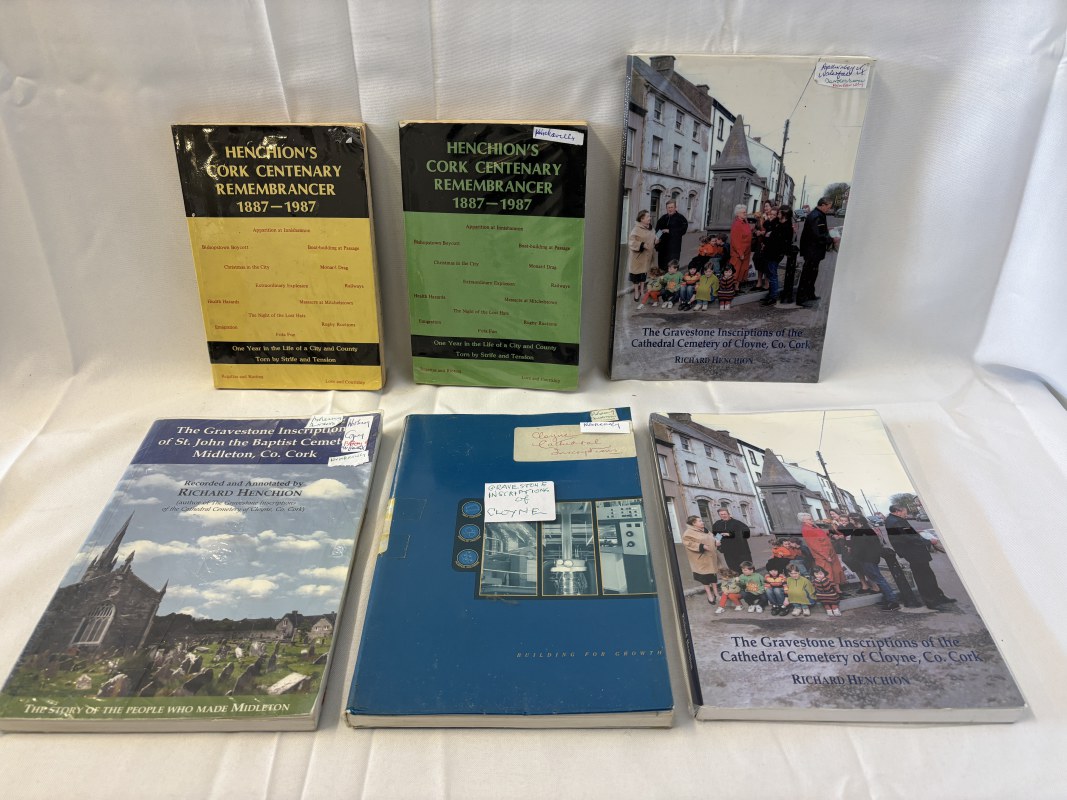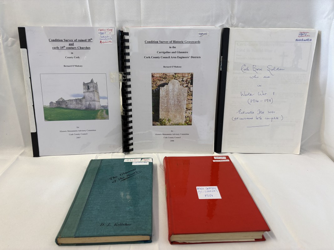 The Glamour of the South by D. L. Kelleher; Irish Castles and Castellated Houses by Harold G. Leask together with Notes on Cork born Soldiers who died in world War I, Condition survey of Historic graveyards in Carrigaline and Glanmire and also of ruined 18th & 19th century churches.