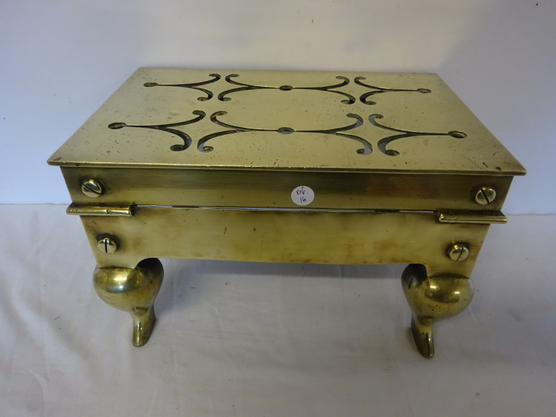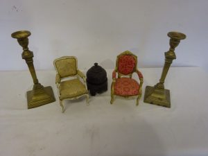 A pair of antique brass candlesticks, two miniature chairs and a small carved timber urn on stand.